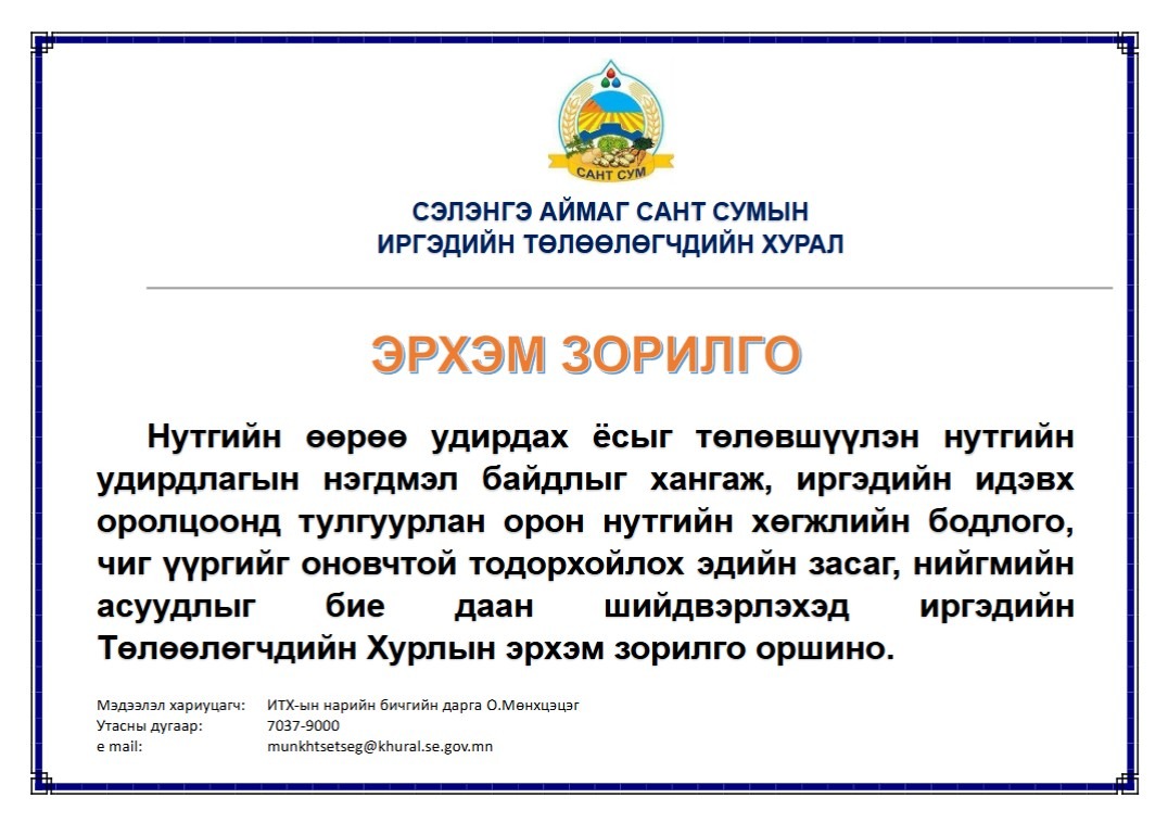 Мэдээлэл хариуцагч: ИТХ-ын нарийн бичгийн дарга О.Мөнхцэцэг